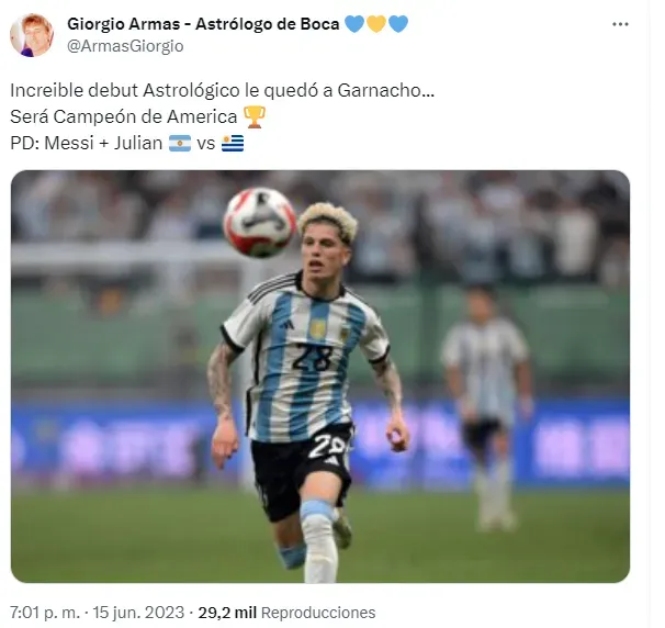 “Increible debut Astrológico le quedó a Garnacho”, comenzó Armas, que agregó que “será Campeón de America”. Además, le dejó un pedido a Scaloni para el próximo encuentro ante Uruguay: “Messi + Julian”, haciendo referencia a la delantera que debe jugar.