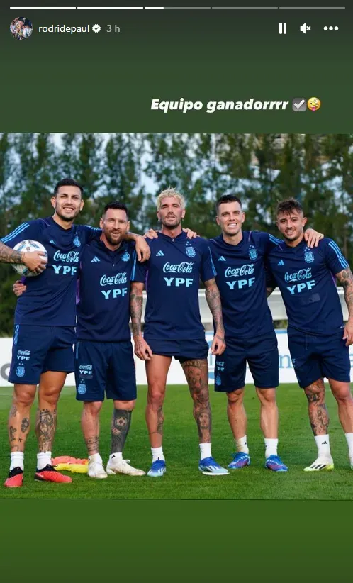 En sus primeras horas con los campeones, el lateral demostró integrarse bien al plantel y, a través del Instagram de Rodrigo De Paul se vio un gesto de los líderes del equipo con él. “Equipo ganador“, publicó el volante de Atlético de Madrid, junto a una foto en la que estaba con Maffeo, Paredes, Messi y Lo Celso.