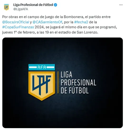 “Por obras en el campo de juego de la Bombonera, el partido entre Sarmiento y Boca, por la #fecha2 de la Copa Sur Finanzas 2024, se jugará el mismo día en que se programó, jueves 1° de Febrero, a las 19 en el estadio de San Lorenzo”, comunicó la Liga Profesional a través de sus canales oficiales.