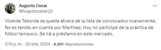A 48 hs. del partido, el DT Xeneize Diego Martínez dió la lista de convocados para enfrentar a Sarmiento y una ausencia llamó la atención: Vicente Taborda se volvió a quedar afuera de los citados.