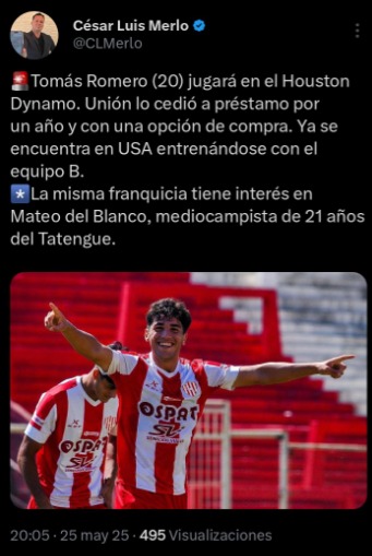 Se confirma la información que adelantó Dario Pignata en la mañana de ADN GOL el día 4 de Abril pasado. Como indicamos, Unión recibió una oferta por parte de Houston Dynamo de la MLS por el delantero Tomás Romero, quién forma parte de la Reserva.