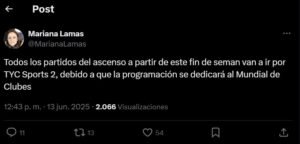 Por el Mundial de Clubes la programación principal de TyC Sports estará abocada en su totalidad al torneo. Por este motivo los partidos del ascenso serán televisados por TYC SPORTS 2, así lo informa la periodista Mariana Lamas: