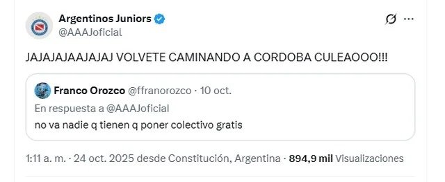 Luego del triunfo por 2-1 gracias a los goles de Hernán López Muñoz y Tomás Molina, la cuenta oficial de Argentinos Juniors citó dicho posteo y aprovechó la situación para chicanear: “Volvete caminando a Córdoba culeaoooo”.