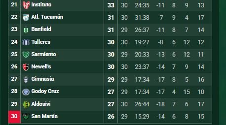 San Martín de San Juan, con 26 puntos, quedó en el fondo pero como estaría descendiendo por los promedios no hay que contarlo y en este momento habría un desempate entre Aldosivi (27) y Godoy Cruz (27). No se toma en cuenta la diferencia de gol.