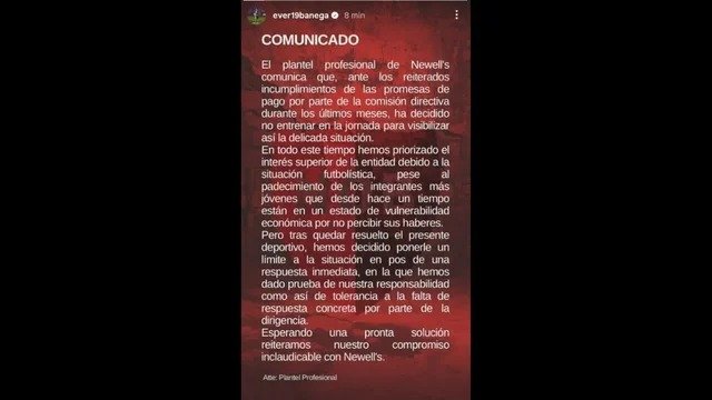 Horas antes y antes de extender la medida a este jueves, el plantel profesional sacó un comunicado contando pormenores de la decisión: «El plantel profesional de Newell’s comunica que, ante los reiterados incumplimientos de las promesas de pago por parte de la comisión directiva durante los últimos meses, ha decidido no entrenar en la jornada para visibilizar así la delicada situación».