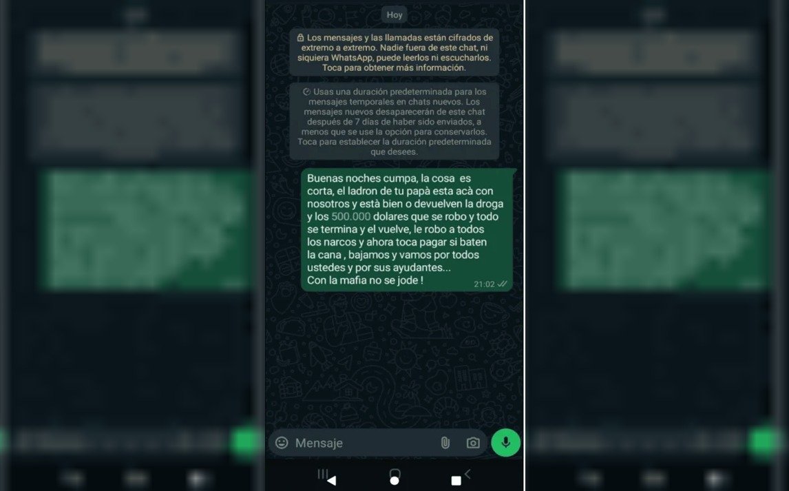 Los barras están sospechados de haber enviado mensajes exigiendo dinero al hijo de Tallone. «El ladrón de tu papá está con nosotros y está bien. O devuelven la droga y los 500.000 dólares que se robó y todo se termina y él vuelve», dice una parte del texto.