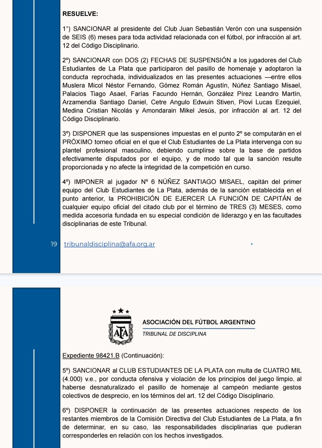 Después de varios días de deliberaciones y tras el descargo correspondiente, AFA hizo pública la sanción para Estudiantes, luego del pasillo de espaldas a Rosario Central, en repudio a la decisión de la máxima entidad del fútbol argentino de coronar campeón al Canalla por la Tabla Anual y asegurar que todos los clubes estaban de acuerdo. Así, se conoció que Juan Sebastián Verón estará suspendido de toda actividad por seis meses, mientras que los futbolistas mencionados en el informe arbitral deberán cumplir con dos fechas de suspensión en 2026.