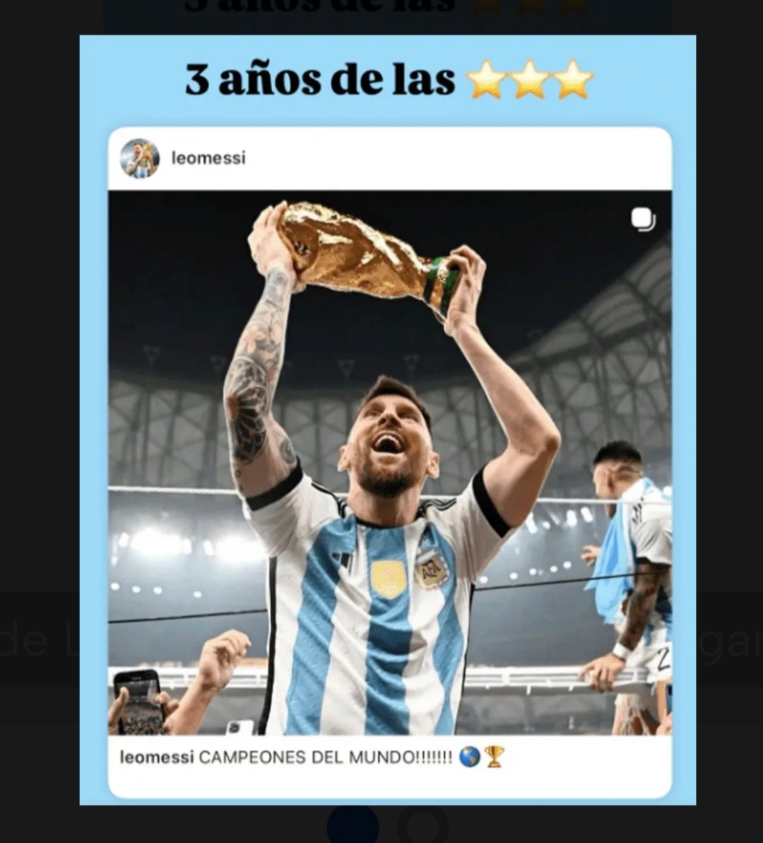 En primer lugar, Messi, capitán de la Albiceleste y mejor jugador de aquel Mundial, escribió: “Tres años de las tres estrellas (con los emojis)”, acompañado de la foto levantando el trofeo que posteó aún en territorio catarí.