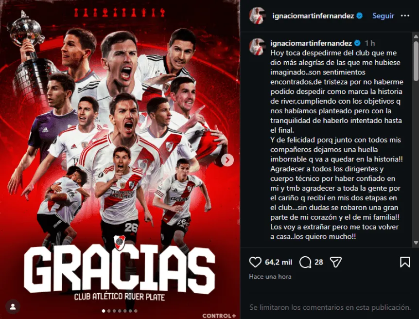 Ignacio Fernández cerró su segundo ciclo en River con un mensaje emotivo en redes y confirmó que continuará su carrera en Gimnasia.