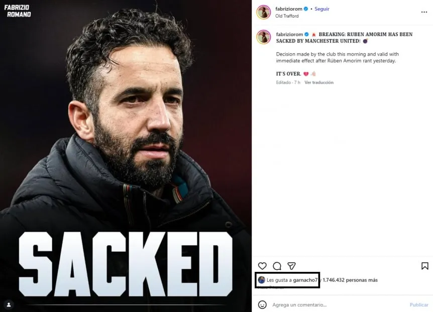 La mañana del lunes llegó con el sorpresivo anuncio de Manchester United, que despidió a Rúben Amorim como entrenador luego del empate ante Leeds, que lo dejó en el sexto lugar de la tabla de posiciones de la Premier League, afuera de los puestos de clasificación a copas internacionales y a 17 puntos del líder Arsenal. Ante el anuncio en redes sociales, hubo una reacción que llamó la atención por sobre el resto: la de Alejandro Garnacho.