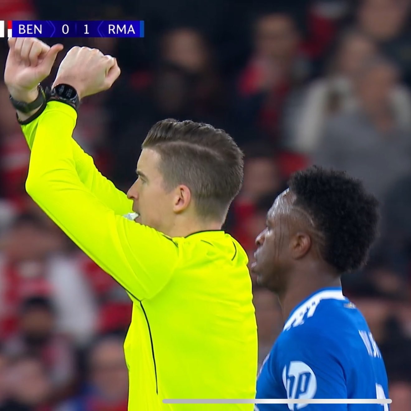 Según las imágenes de la transmisión, el futbolista del Benfica se acercó al brasileño tapándose la boca al hablar. La reacción inmediata de Vinícius fue dirigirse al árbitro, quien realizó el gesto del protocolo contra el racismo y detuvo el encuentro durante unos diez minutos para calmar la situación y evaluar lo sucedido.