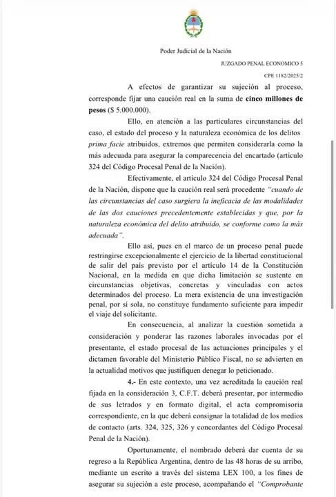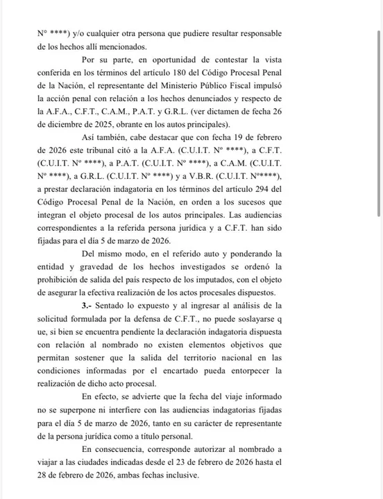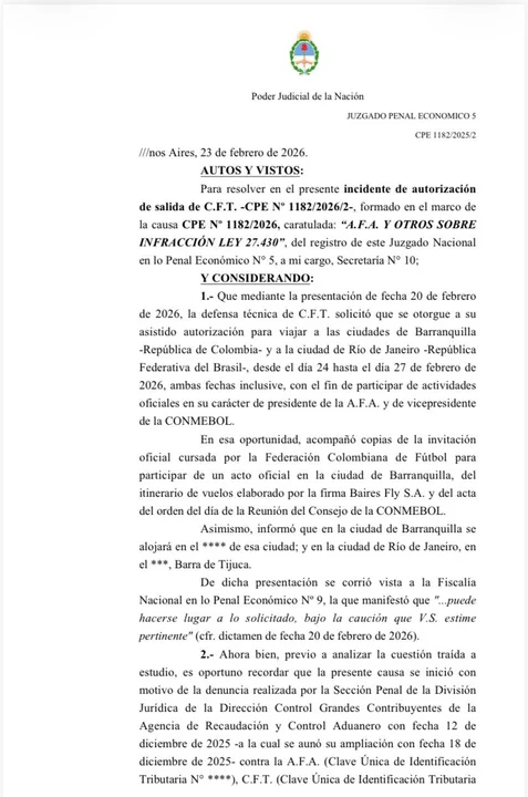 El juez Diego Amarante autorizó la salida del país de Claudio «Chiqui» Tapia, pese a la restricción vigente por la causa penal económica en la que se encuentra imputado. El presidente de la AFA viajará esta semana a Barranquilla y Río de Janeiro tras depositar una caución real de cinco millones de pesos. La justicia habilitó el traslado al considerar que no existe riesgo de entorpecimiento procesal y que las fechas no interfieren con su indagatoria, prevista para el 5 de marzo.