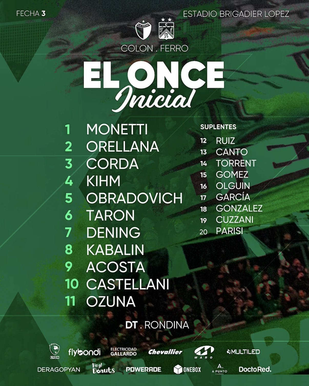 Ferro: Fernando Monetti; Nazareno Kihm, Juan Orellana, Misael Tarón, Sebastián Corda; Ozuna, Felipe Obradovich, Gonzalo Castellani, Matías Kabalín; Mateo Acosta y Emanuel Dening. DT: Sergio Rondina.