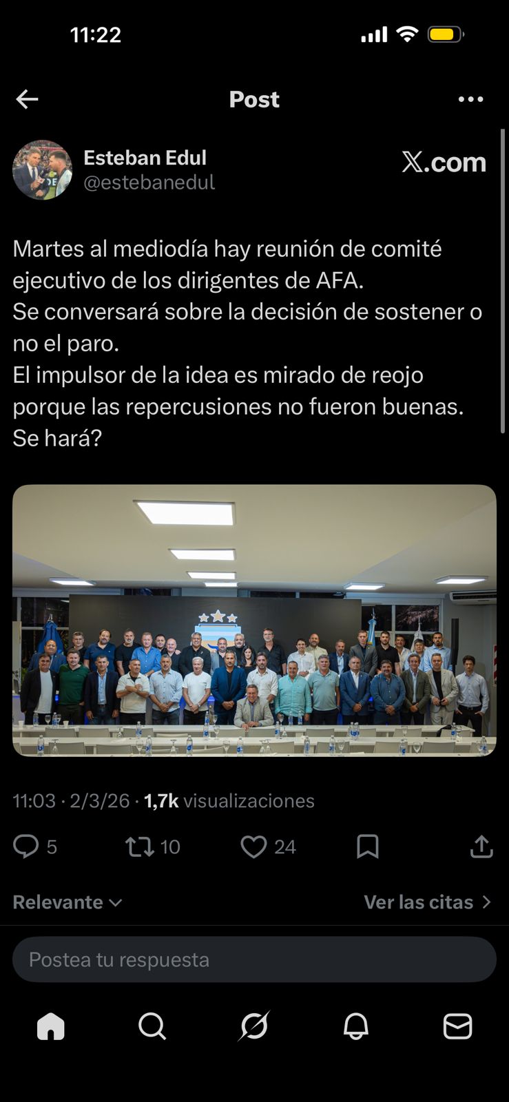 Sin embargo, Esteban Edul informó en su cuenta de X que mañana habrá una reunión al mediodia de comite ejecutivo y allí se decidirá si se mantiene el paro del 5 al 8 de marso o si se  levanta el paro y la fecha 9 se juega con normalidad