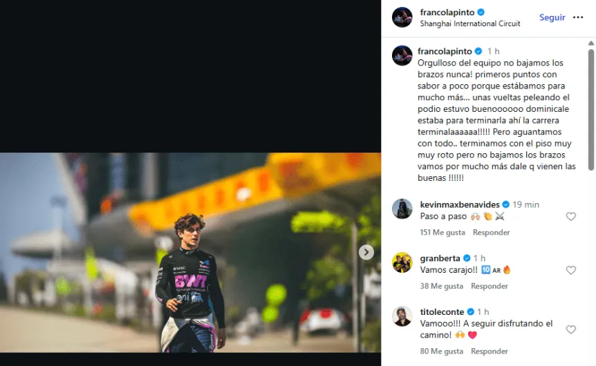 Sobre el final intentó superar a Carlos Sainz para quedarse con el noveno lugar, pero no le alcanzó. Aun así, el argentino rescató el esfuerzo del equipo y dejó un mensaje claro en redes: “Primeros puntos con sabor a poco, porque estábamos para mucho más”.