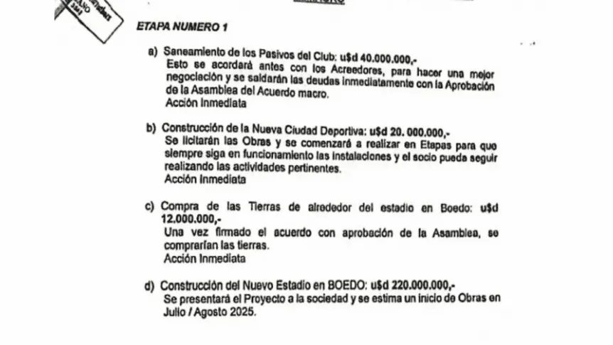 El texto, de 20 páginas y firmado ante escribano, planteaba una inyección económica en dos etapas. La primera incluía el saneamiento de deudas, estimadas en unos 40 millones de dólares, y la construcción de un estadio para 55 mil personas en Boedo junto a una ciudad deportiva.