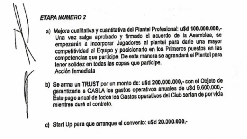 La segunda parte contemplaba fondos para el plantel profesional y gastos operativos anuales. A cambio, el club debía ceder ingresos por ventas de jugadores, derechos económicos y federativos, derechos de televisión y activos vinculados al estadio. El acuerdo no implicaba la conversión formal en sociedad anónima, pero incluía una instancia de auditoría previa. También establecía una cláusula de confidencialidad y un plazo de 45 días para su aprobación.