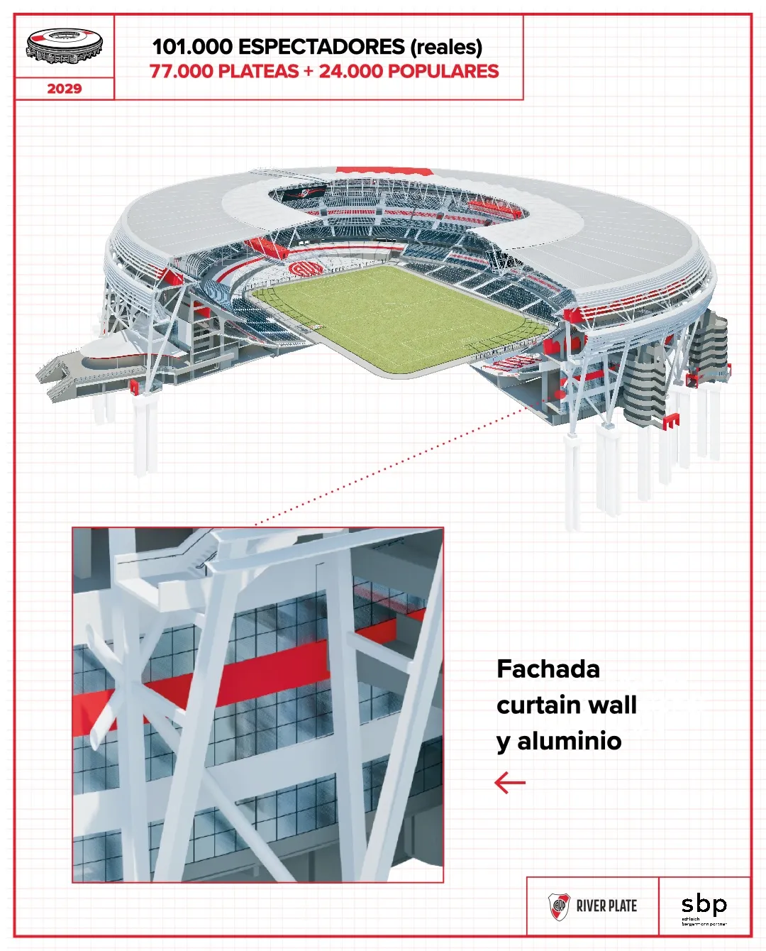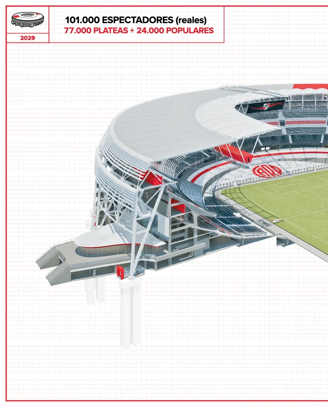 En sus redes sociales River publicó un nuevo posteo sobre cómo seguirán los trabajos en el Estadio Más Monumental, debido a que se está llevando a cabo el proceso para el techado y la ampliación a más de 100 mil espectadores, para convertirlo en la cancha con más aforo de Sudamérica.