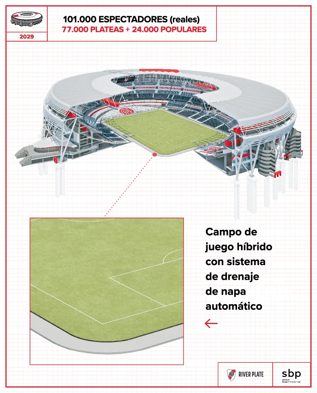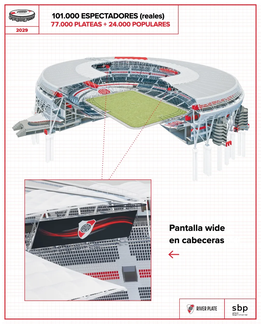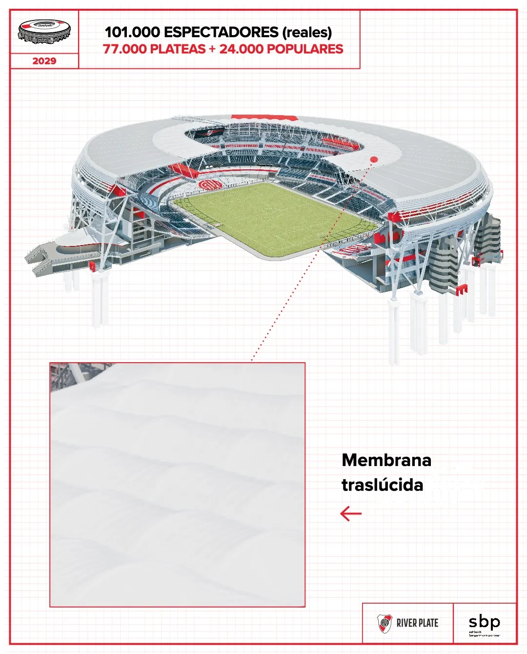Para llegar a los 101 mil espectadores, la institución informó que el Más Monumental tendrá lugar para 77 mil plateas, sumado a otras 24 mil populares. De esta manera, se construirán 16 mil lugares nuevos para seguir sumando aforo en la cancha.